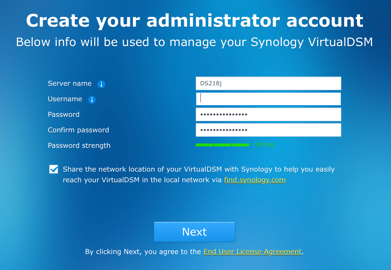 After the installation is completed it's time to setup your account and define some basic settings (like update method and time). Enter your desired username and password and continue to the next step.
