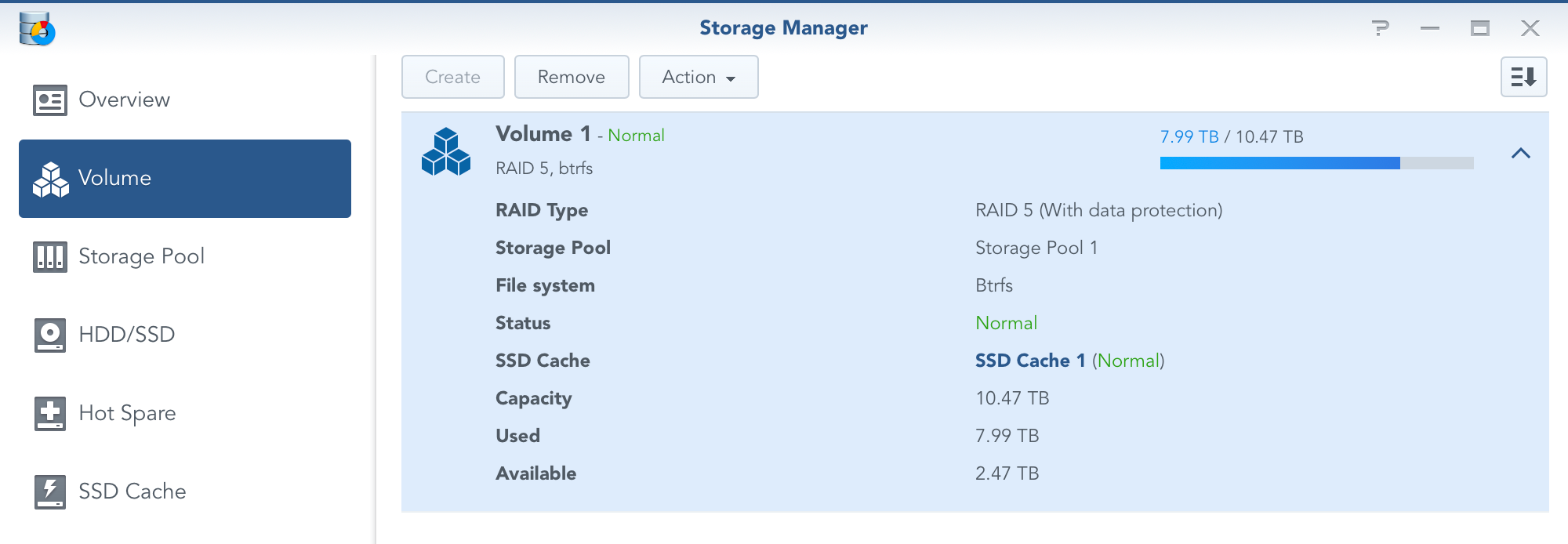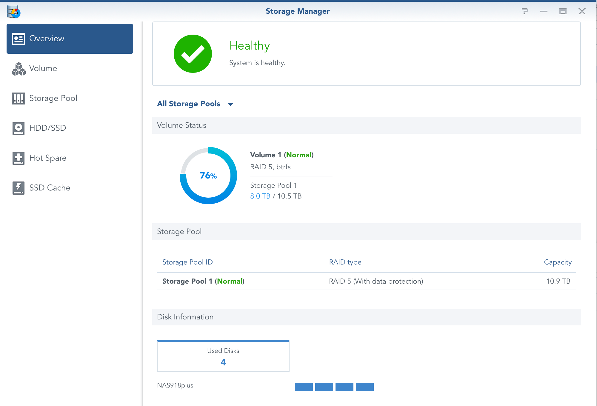 This will open up Storage Manager that will list all the options regarding your volumes, pools, individual HDDs, any host spare drives that you might have as well as SSD cache (on selected models).